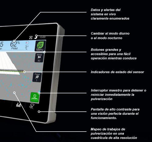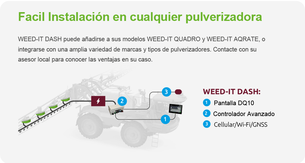 La nueva pantalla táctil DASH DQ10 de última generación le permite monitorear y controlar completamente su sistema de detección y pulverización WEED-IT QUADRO proporcionándole información directa de su desempeño en el campo.Mapeo de lo recorrido y aplicado
