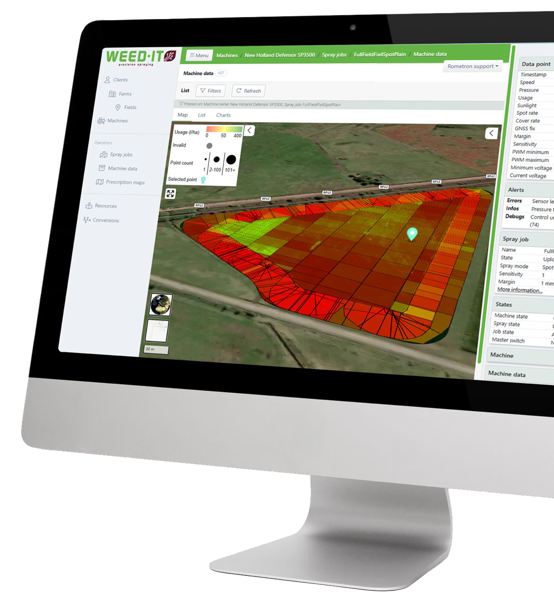 Dentro del PORTAL DASH, los usuarios pueden cargar mapas de prescripción. Estos mapas suelen crearse en sistemas externos de gestión agrícola. WEED-IT DASH ofrece una herramienta para procesar estos mapas, pero no proporciona asesoramiento agronómico. Estos mapas también pueden generarse a partir de trabajos de pulverización anteriores. Por ejemplo, si un usuario desea utilizar una estrategia de pulverización de doble golpe, al colocar un archivo de una aplicación dirigida anterior, se puede cargar fácilmente y el equpo repetira el patron de aplicacion para garantizar la aplicacion en las mismas malezas. Este proceso se realiza a través del portal gracias a los formatos de archivo que utiliza WEED-IT.Estructura clara y facilidad de uso